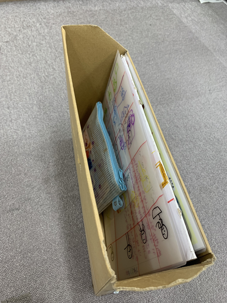 絵日記3枚が揃うまで、保管や管理は子どもたち自身が行うことになります。子どもたちには、それぞれ個人ボックスというものが設けてあり、ボックス内の整理整頓の意識をもってもらえたらと思っています。