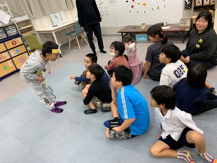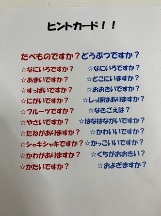 また、普段人前に立つことが恥ずかしかったり消極的な児も手を挙げて質問者役に回り、スタッフが側につきながらではありますが、ヒントカードを見ながら質問をしていき成功すると嬉しそうにしている姿を見られた時は、私たちも嬉しかったです🤭